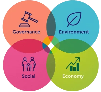 Vi arbetar efter en utökad ESG-modell där vi även lyfter fram ekonomisk hållbarhet som en nyckelfaktor. Alla fyra delar samverkar i ett hållbart företag – och ingen får tappa.